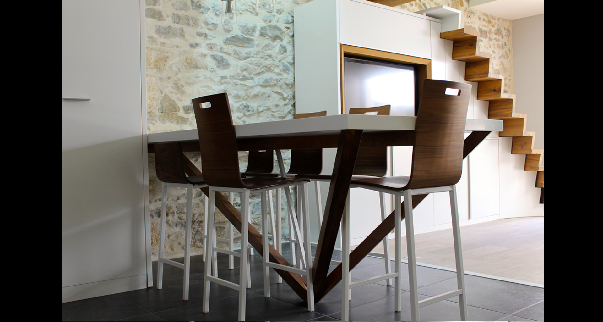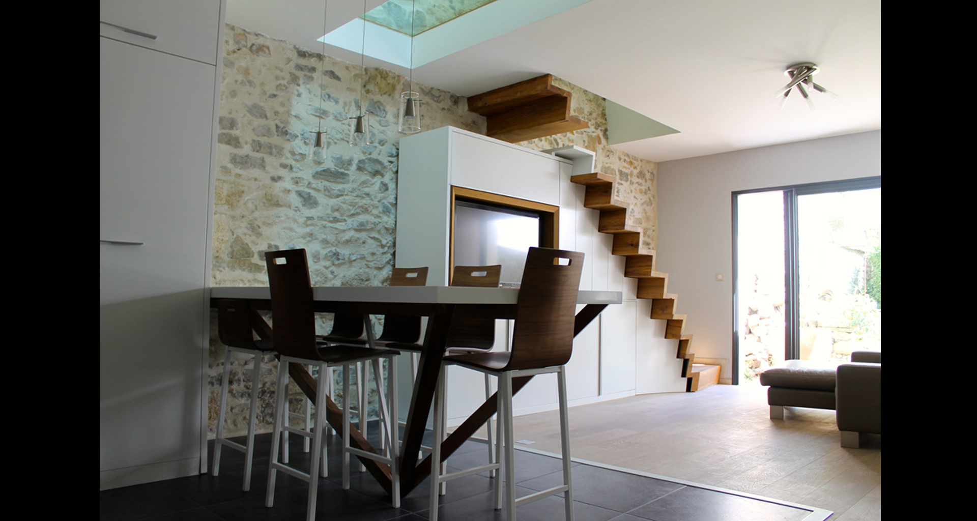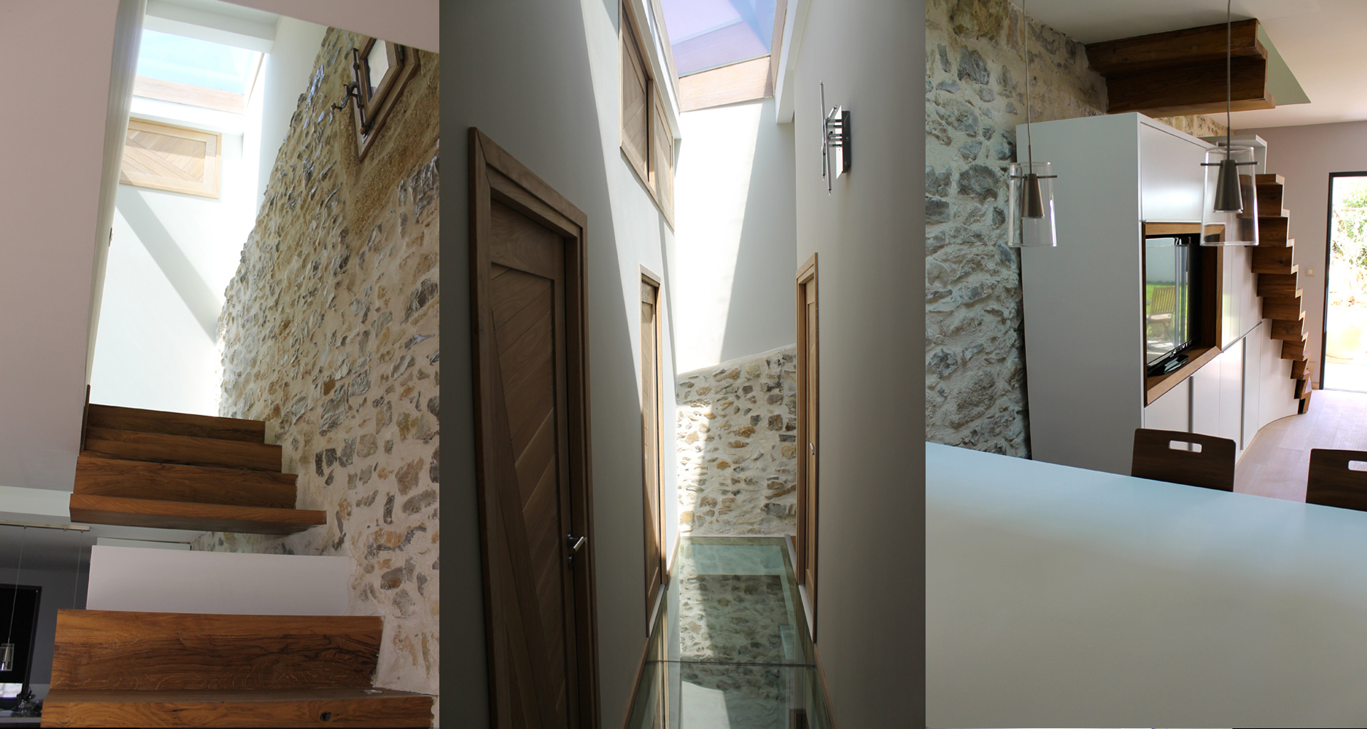 Ce Projet est le premier réalisé en 2014, pensé et dessiné à 100% par Frédéric Roussel. Cette maison de village manquait de lumière et il fallait apporter de la clarté. La verrière et le sol en verre feuilleté trempé donnent l'impression d'espace pour une surface inférieure à 100m². L'escalier suspendu en vieux chêne massif est une réelle performance contre la gravité. Cette réalisation rend hommage aux matériaux nobles: la pierre, l'escalier en vieux chêne massif, le verre, le Corian, la laque...