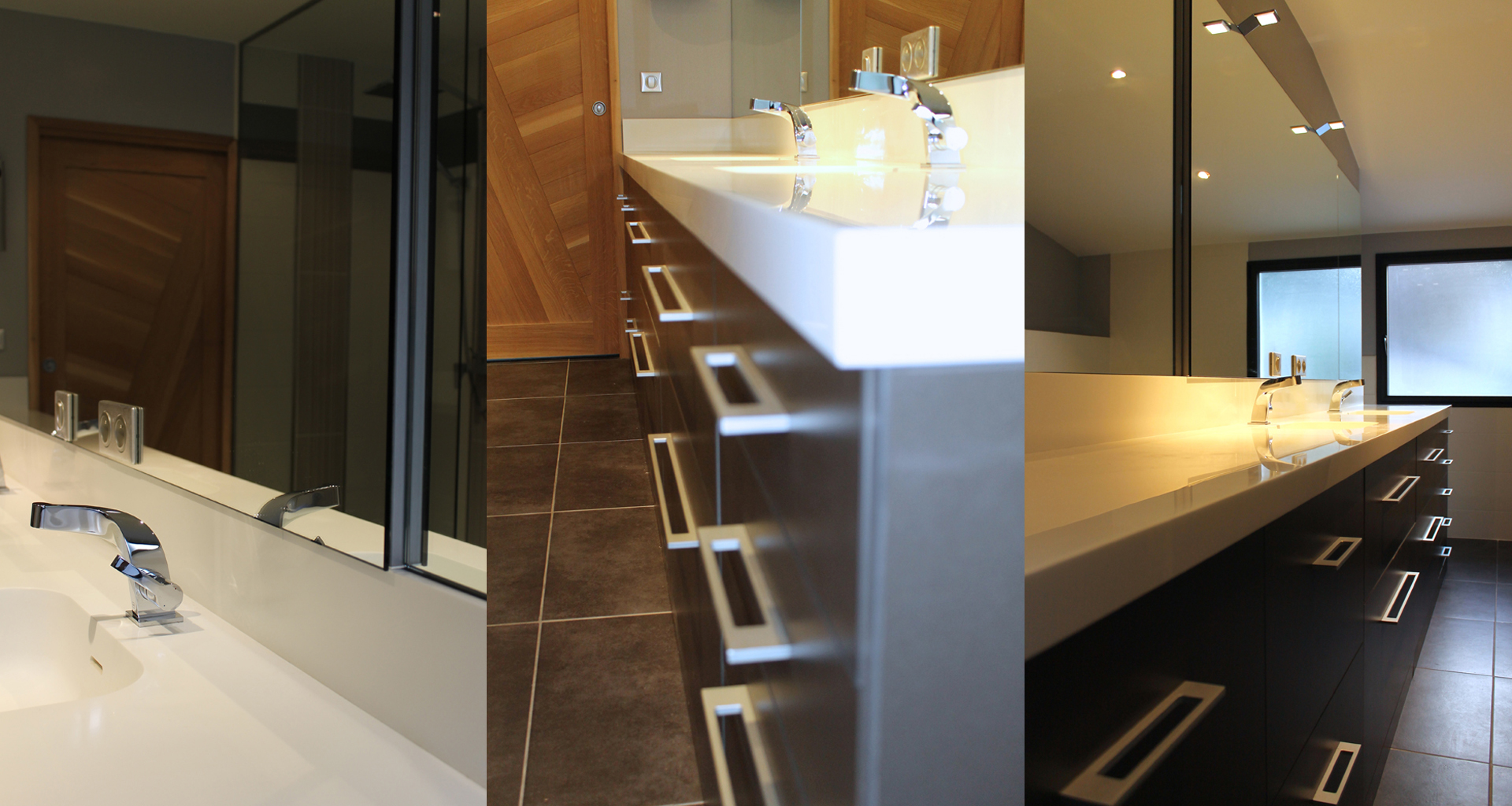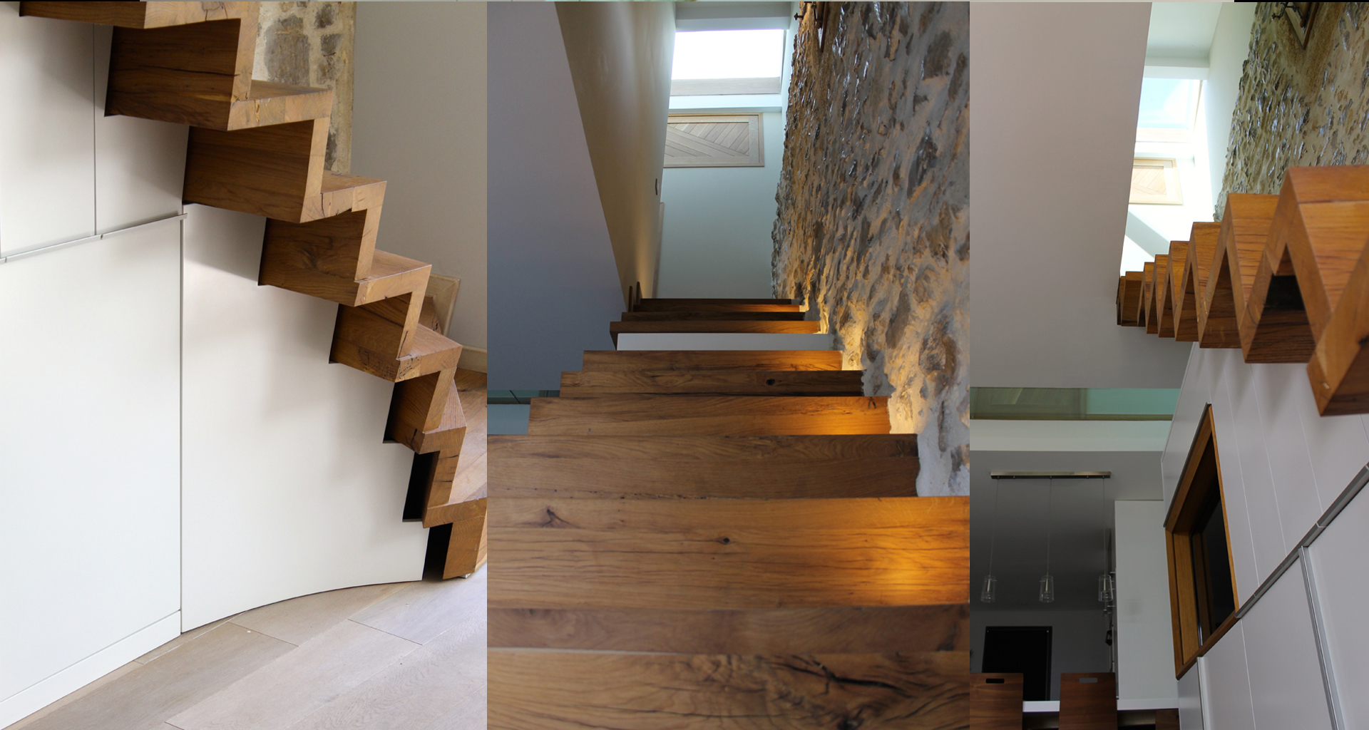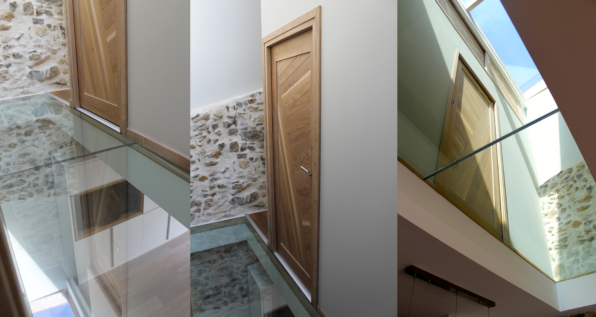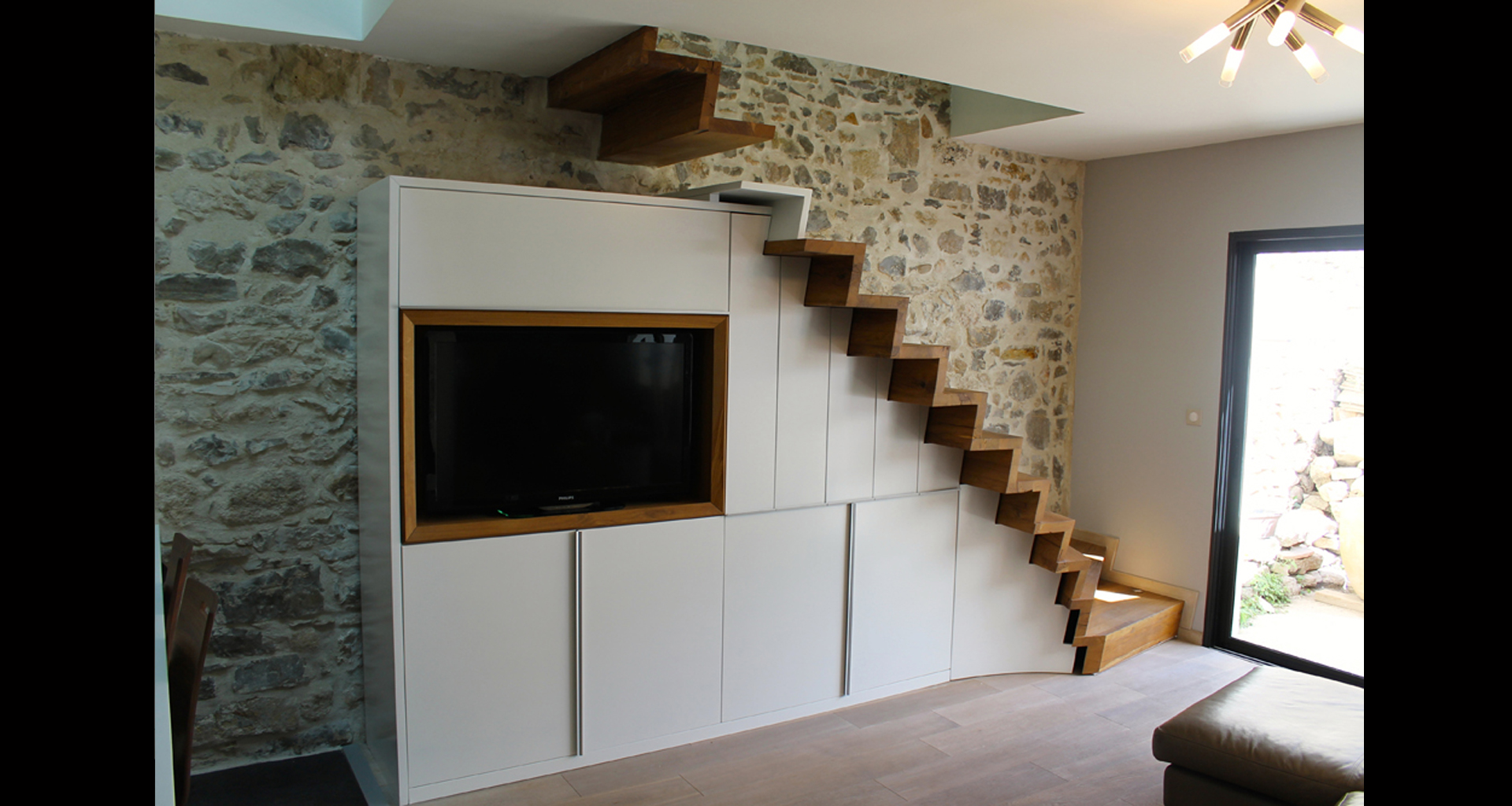 Ce Projet est le premier réalisé en 2014, pensé et dessiné à 100% par Frédéric Roussel. Cette maison de village manquait de lumière et il fallait apporter de la clarté. La verrière et le sol en verre feuilleté trempé donnent l'impression d'espace pour une surface inférieure à 100m². L'escalier suspendu en vieux chêne massif est une réelle performance contre la gravité. Cette réalisation rend hommage aux matériaux nobles: la pierre, l'escalier en vieux chêne massif, le verre, le Corian, la laque...