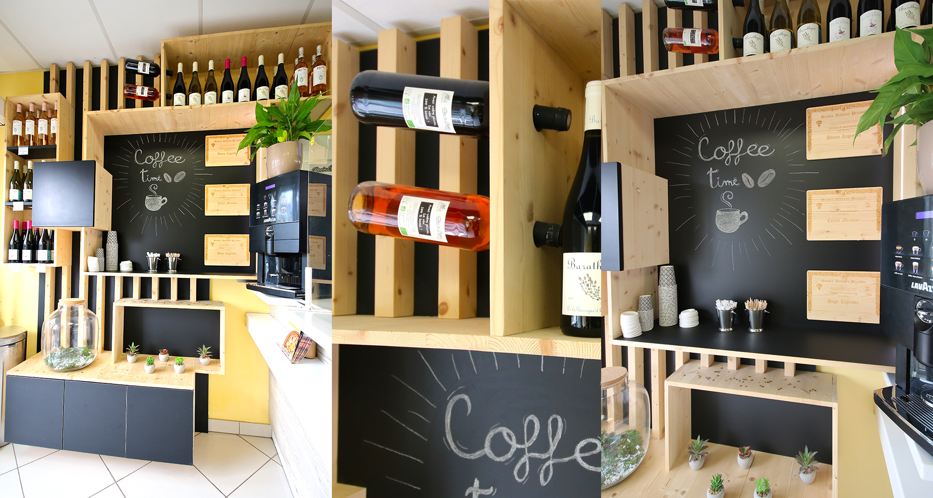 Adrien nous a rencontré en 2020 pour améliorer son magasin. Réalisée depuis peu de temps sa boutique avait besoin d'un espace de vente additionnel. Aprés avoir écouté ses besoins, nous lui avons proposé un espace convivial à l'image de sa société. Le mélange de panneaux noir mat et de bois massif apportent de la chaleur au magasin. L'originalité est apportée par les peintures ardoise et l'exposition de leurs diplomes gravés à même le bois.