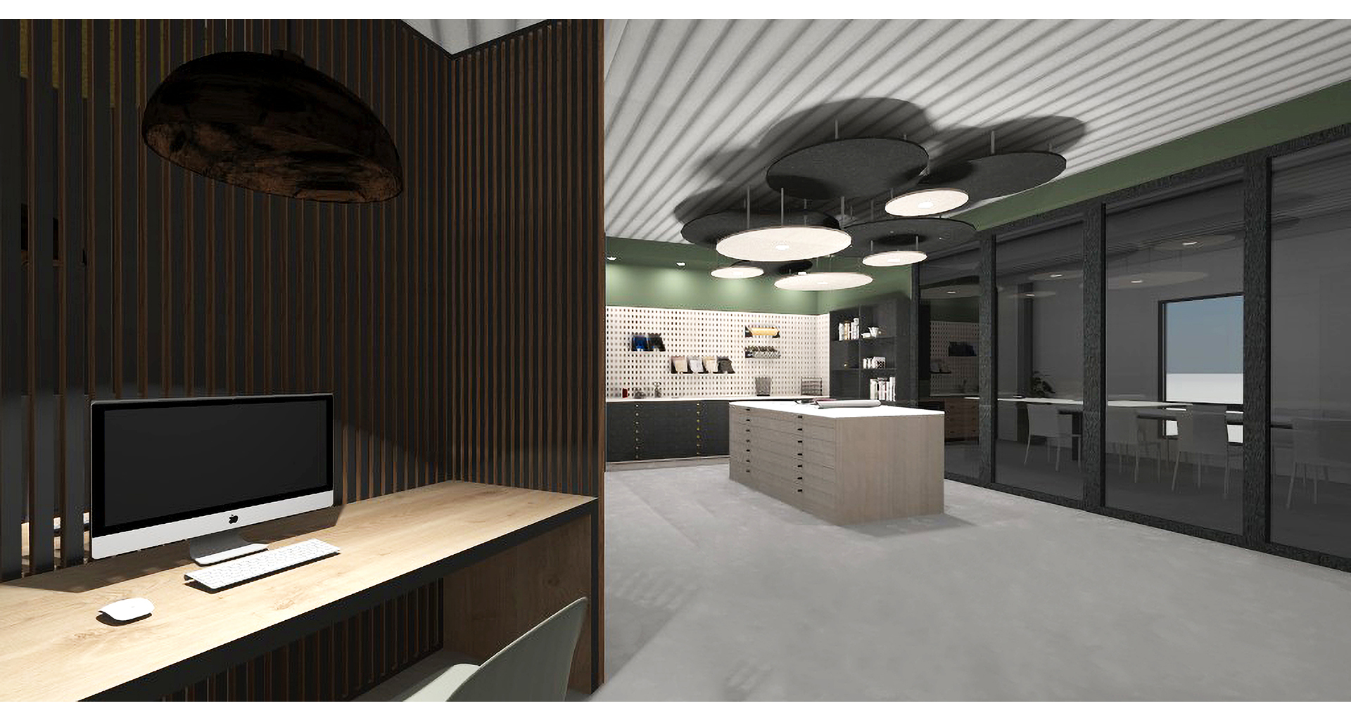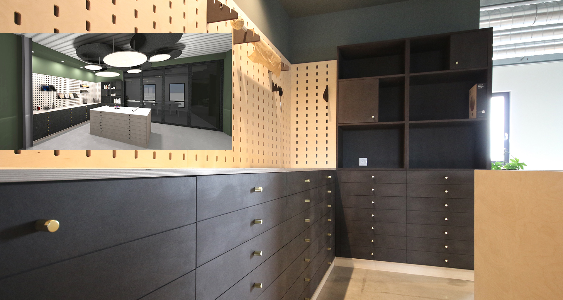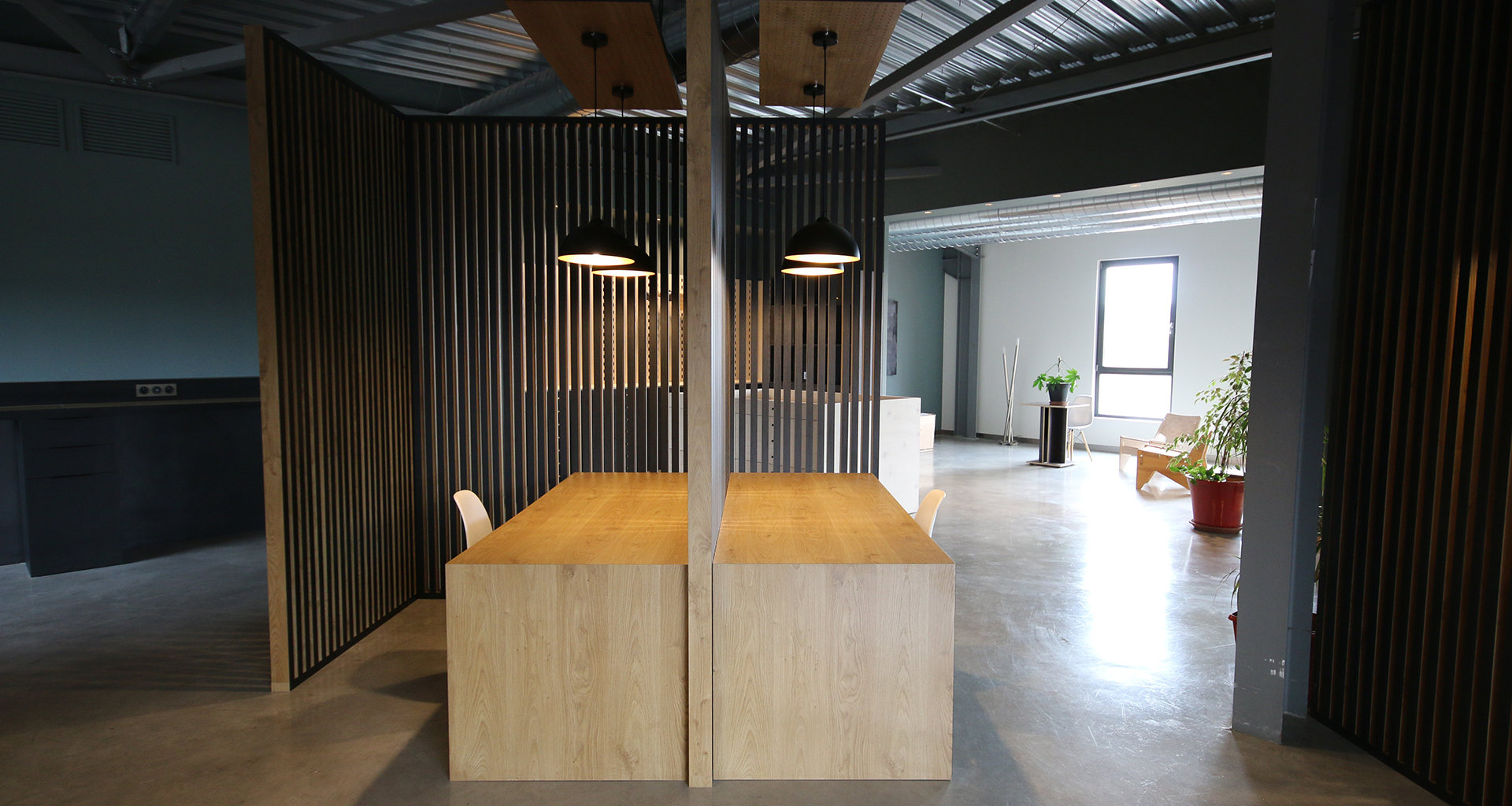 Ellène est un espace de travail et de réflexion. Nous avons besoin de calme, mais aussi de partage pour aiguiser la créativité. Pour cela nous avons choisi un open space qui préserve l'intimité grace à une série de claustra bi-matière. La table lumineuse en Corian gravé est un outil formidable pour le dessin. Le Peg-Board est également le fruit de notre créativité.
