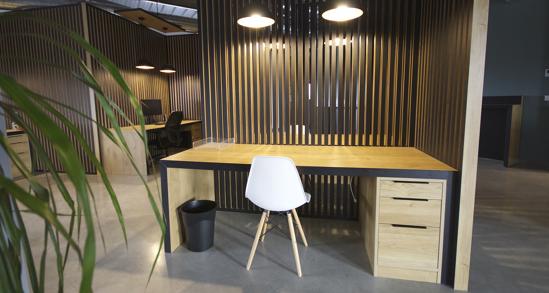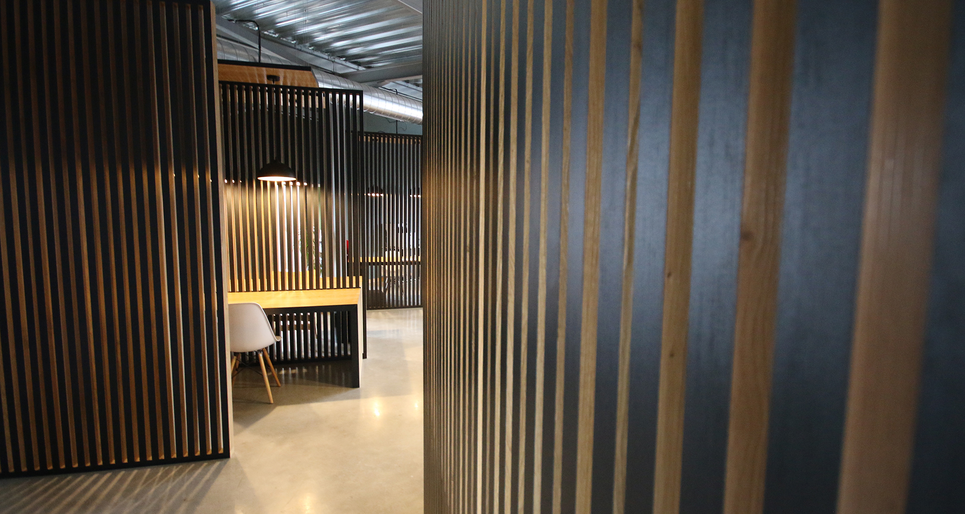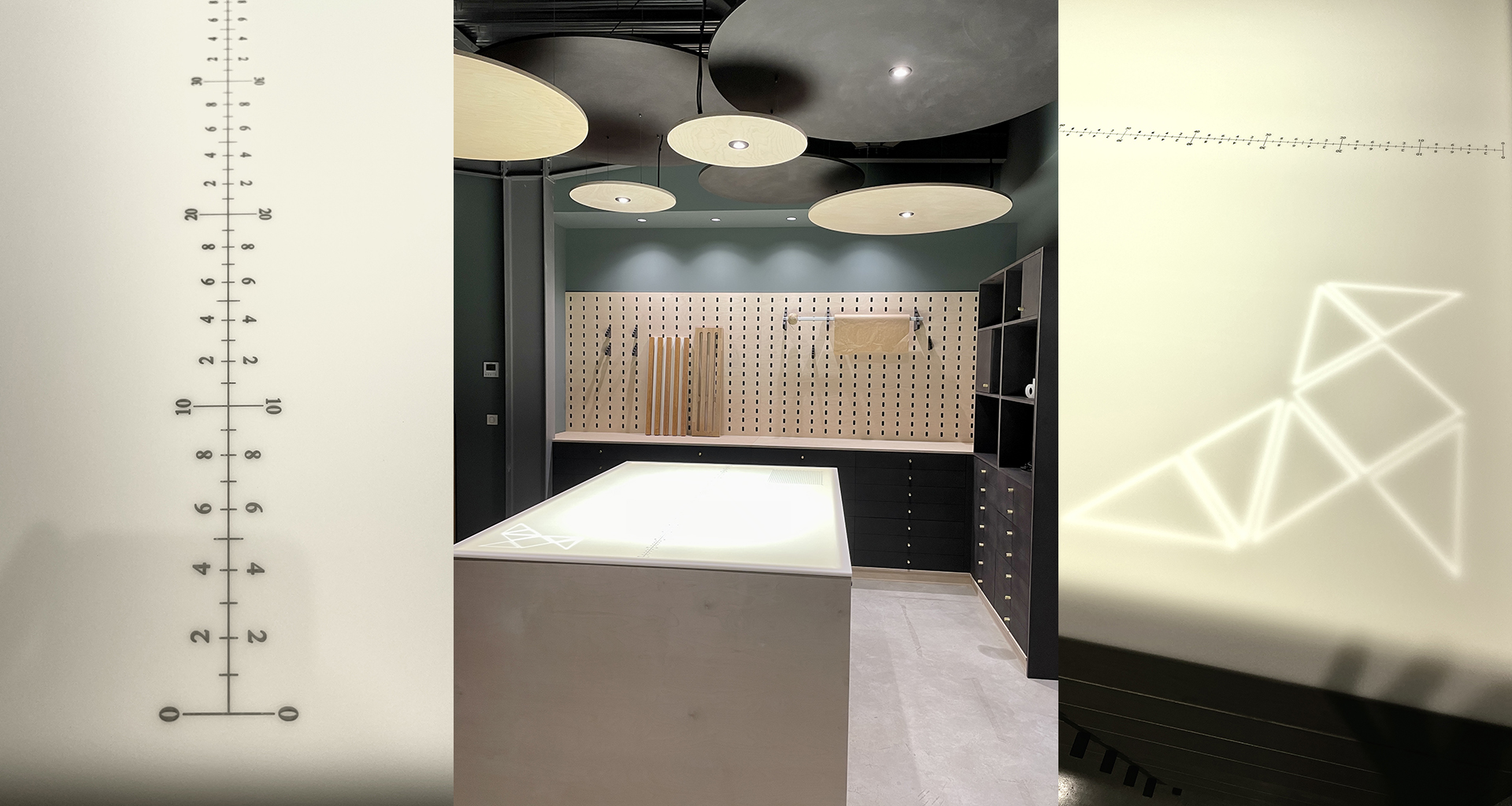 Ellène est un espace de travail et de réflexion. Nous avons besoin de calme, mais aussi de partage pour aiguiser la créativité. Pour cela nous avons choisi un open space qui préserve l'intimité grace à une série de claustra bi-matière. La table lumineuse en Corian gravé est un outil formidable pour le dessin. Le Peg-Board est également le fruit de notre créativité.